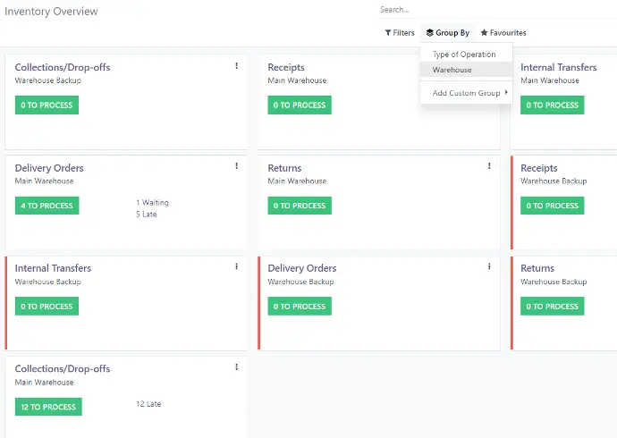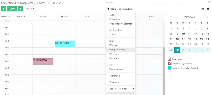Dashboard for a single view of all collections and drop-offs, viewed by Warehouse or Type of Operation