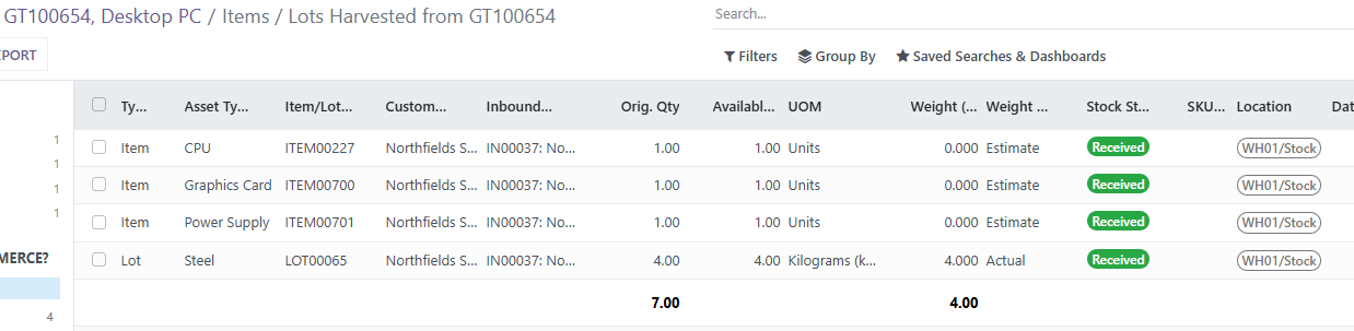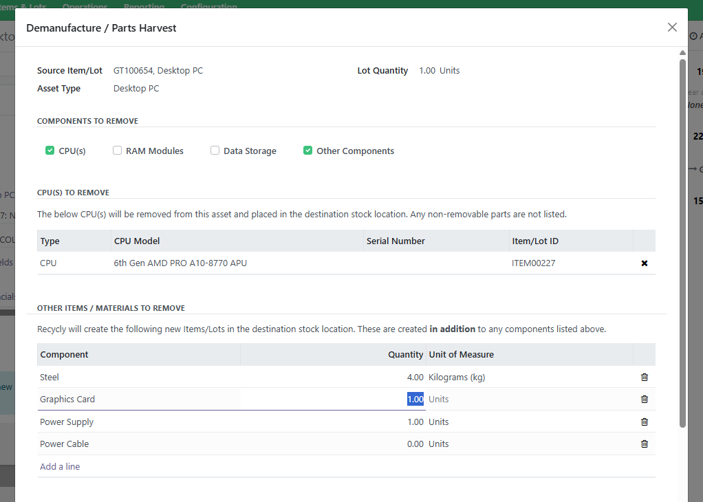 Recycly allows you to handle both of these activities using our Parts Harvesting / Demanufacturing functionality.