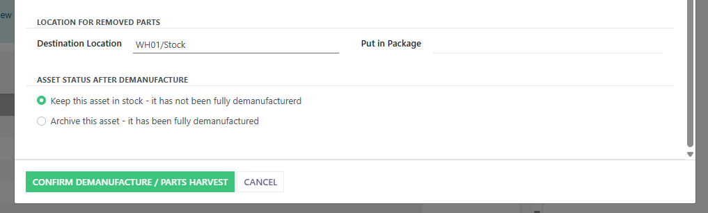 With a configured BOM for the asset type, you can now use the Parts Harvest / Demanufacture function against each invidiual asset.