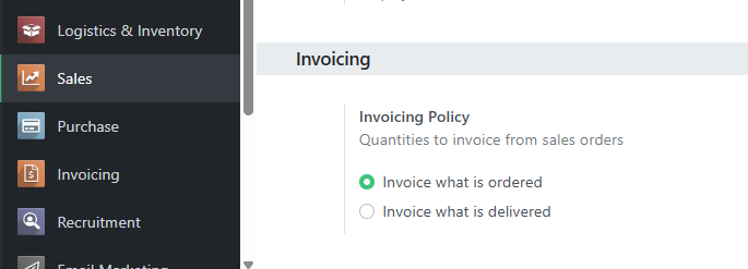If you choose the "delivered quantities" invoicing policy, Recycly will only allow you to create an invoice after at least part of the order has been delivered. This policy is typically used for physical goods, where invoicing should only occur after actual delivery to the customer.