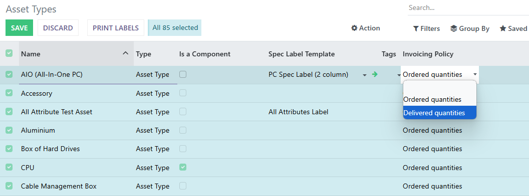 To configure the Invoicing Policy for each asset type, go to the Asset Types & Services app, and turn on the Invoicing Policy column. You can use the multi-edit capability of Recycly to set this en-masse.
