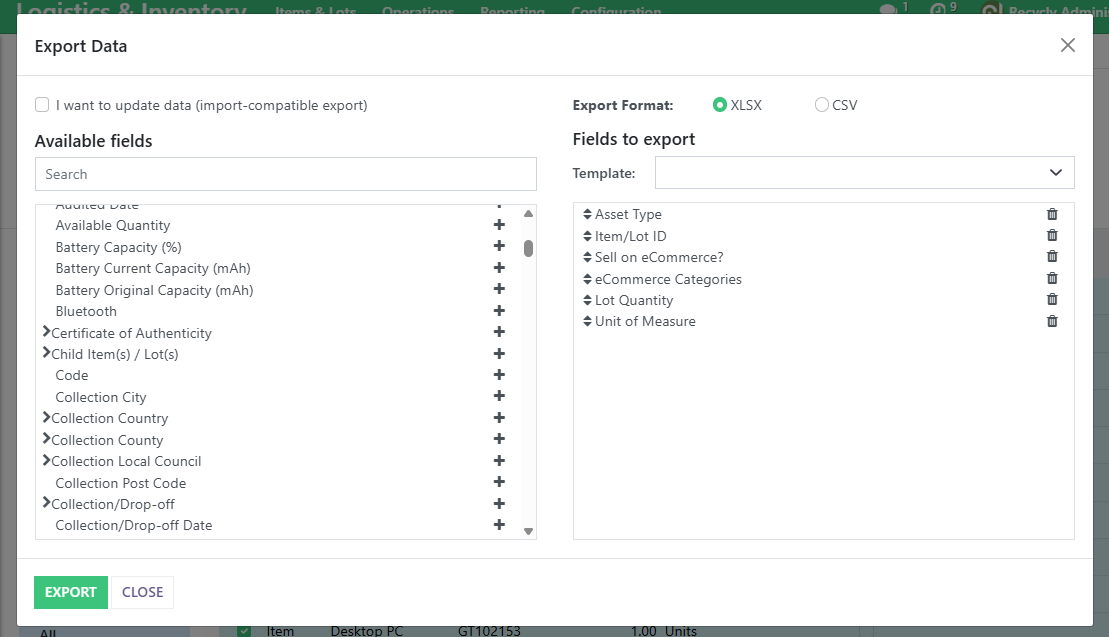 Next time you open the Export window from the same area of Recycly, select your saved template from the dropdown to instantly load your preferred fields.