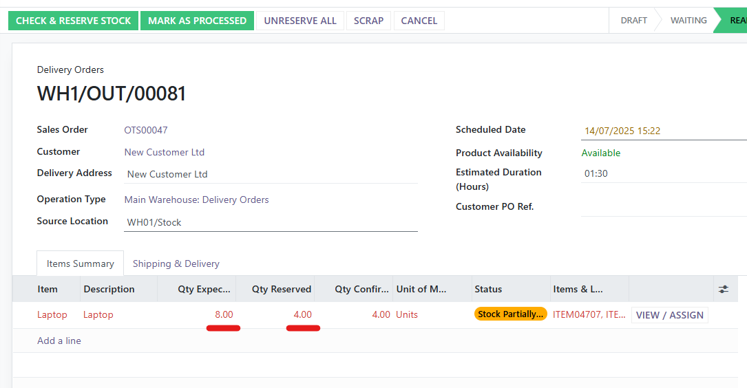 It is possible to part-ship orders. In the example below, we have a delivery order for which we're only shipping 4 out of an expected 8 Laptops