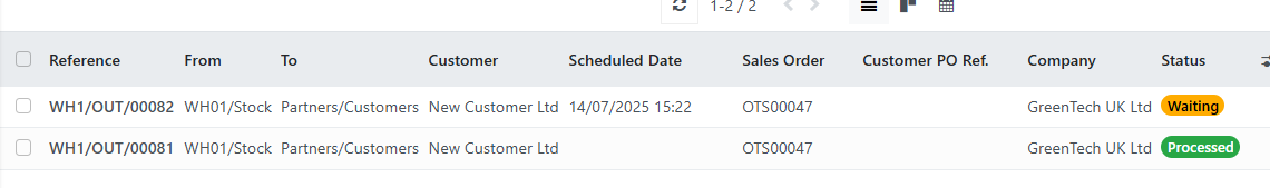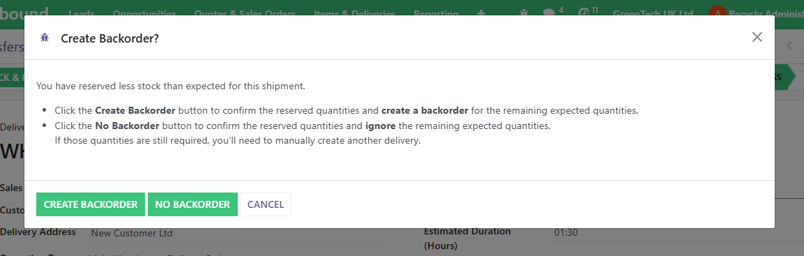 The Backorder has also been created. This can be seen by returning to the Sales Order, and observing that the Deliveries button now has an additional delivery:
