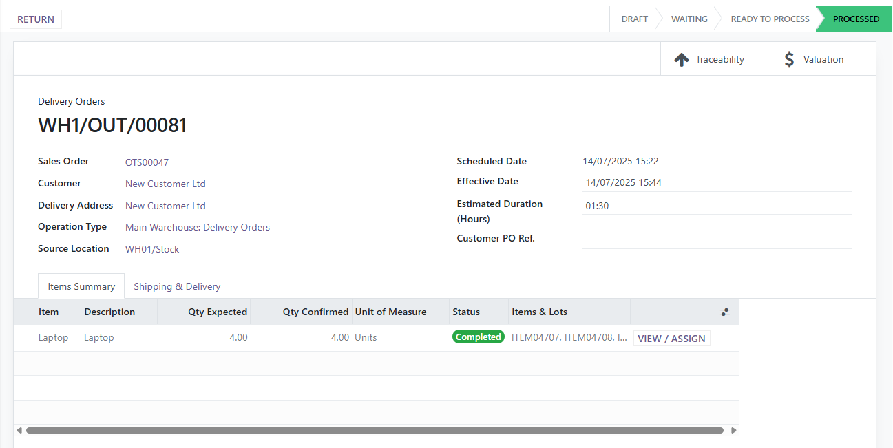 After clicking the Create Backorder button, the completed shipment (for the first 4 laptops) will be marked as processed